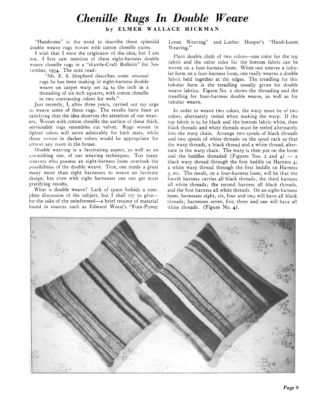 Chenille Rugs in Double Weave, Hickman, Elmer Wallace. Weaver, Vol. 3 No. 2 (April 1938), 6 pages. Note: PDF provided by Judith Combs. Posted September 2, 2006. SAMPLE PAGE. File size 597 KB PDF