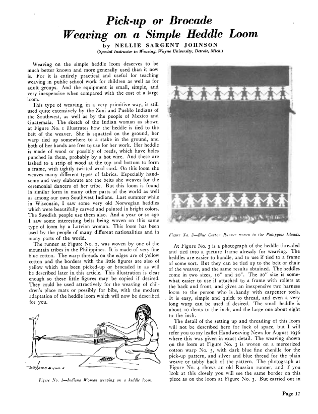 Pick-up or Brocade Weaving on a Simple Heddle Loom, Johnson, Nellie Sargent. Weaver, Vol. 3 No. 2 (April 1938), 3 pages. Note: PDF provided by Judith Combs. Posted September 2, 2006. SAMPLE PAGE. File size 337 KB PDF