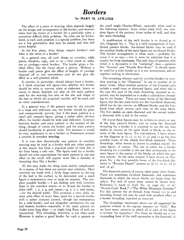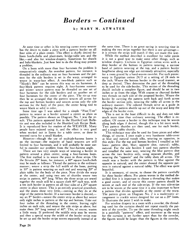 Borders, Atwater, Mary Meis. Weaver, Vol. 3 No. 4 (April 1938), 5 pages. Note: PDF provided by Judith Combs. Posted September 17, 2006. SAMPLE PAGE. File size 424 KB PDF