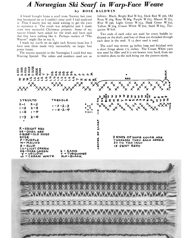 A Norwegian Ski Scarf in Warp-Face Weave, Baldwin, Rose. Weaver, Vol. 3 No. 2 (April 1938), 1 page. Note: PDF provided by Judith Combs. Posted September 2, 2006. SAMPLE PAGE. File size 94 KB PDF