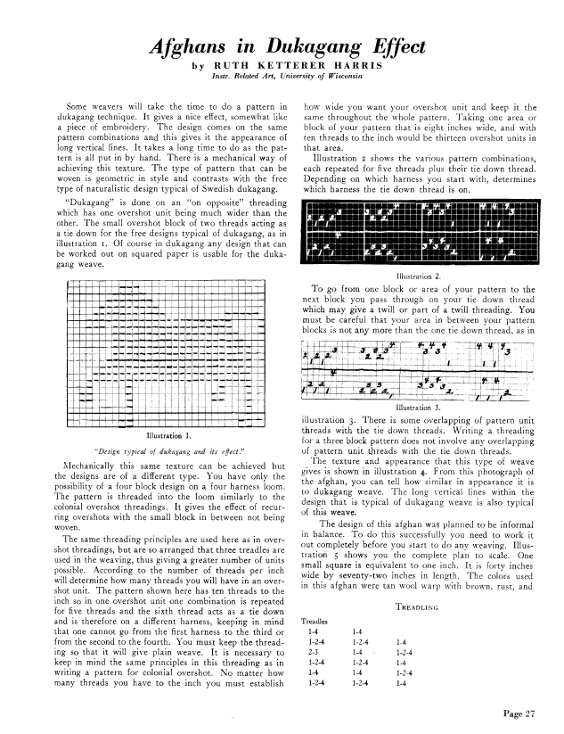Afghans in Dukagang Effect, Harris, Ruth Ketterer. Weaver, Vol. 3 No. 2 (April 1938), 2 pages. Note: PDF provided by Judith Combs. Posted September 2, 2006. SAMPLE PAGE. File size 276 KB PDF