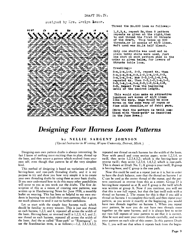 Designing Four Harness Loom Patterns, Johnson, Nellie Sargent. Weaver, Vol. 3 No. 3 (July 1938), 4 pages. Note: PDF provided by Judith Combs. Posted September 2, 2006. SAMPLE PAGE. File size 576 KB PDF