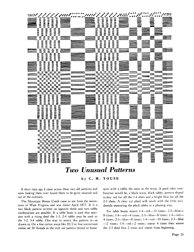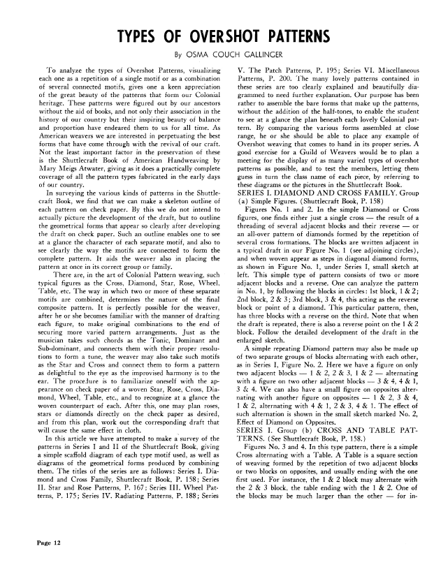 Types of Overshot Patterns, Gallinger, Osma Couch. Weaver, Vol. 7 No. 2 (July 1942), 6 pages. Note: PDF provided by Judith Combs. Posted September 2, 2006. SAMPLE PAGE. File size 854 KB PDF