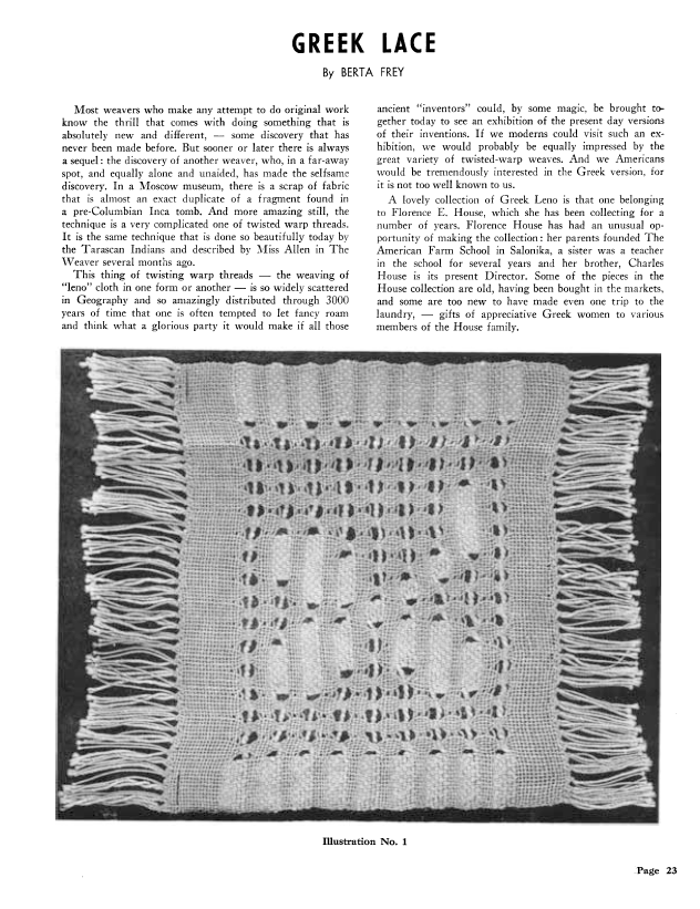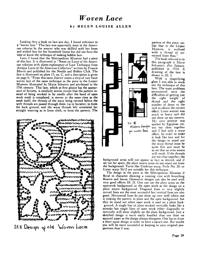 Woven Lace, Allen, Helen Louise. Weaver, Vol. 3 No. 3 (July 1938), 2 pages. Note: PDF provided by Judith Combs. Posted September 2, 2006. SAMPLE PAGE. File size 187 KB PDF