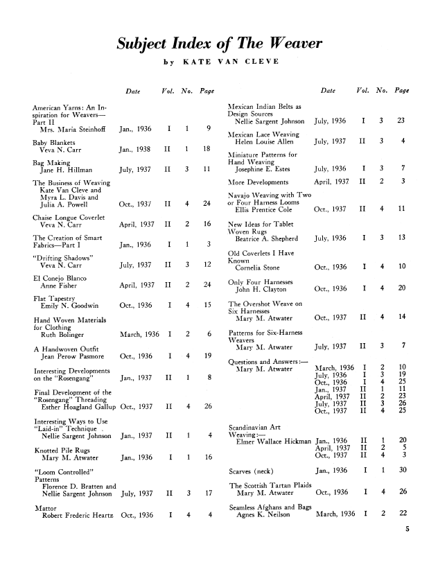 Subject Index of The Weaver, Cleve, Kate Van. Weaver, Vol. 3 No. 4 (October 1938), 1 page. Note: PDF provided by Judith Combs. Posted September 2, 2006. SAMPLE PAGE. File size 60 KB PDF