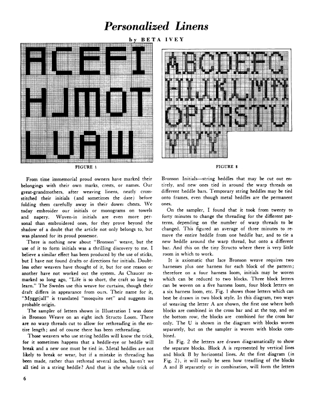 Personalized Linens, Ivey, Beta. Weaver, Vol. 3 No. 4 (October 1938), 6 pages. Note: PDF provided by Judith Combs. Posted September 2, 2006. SAMPLE PAGE. File size 615 KB PDF