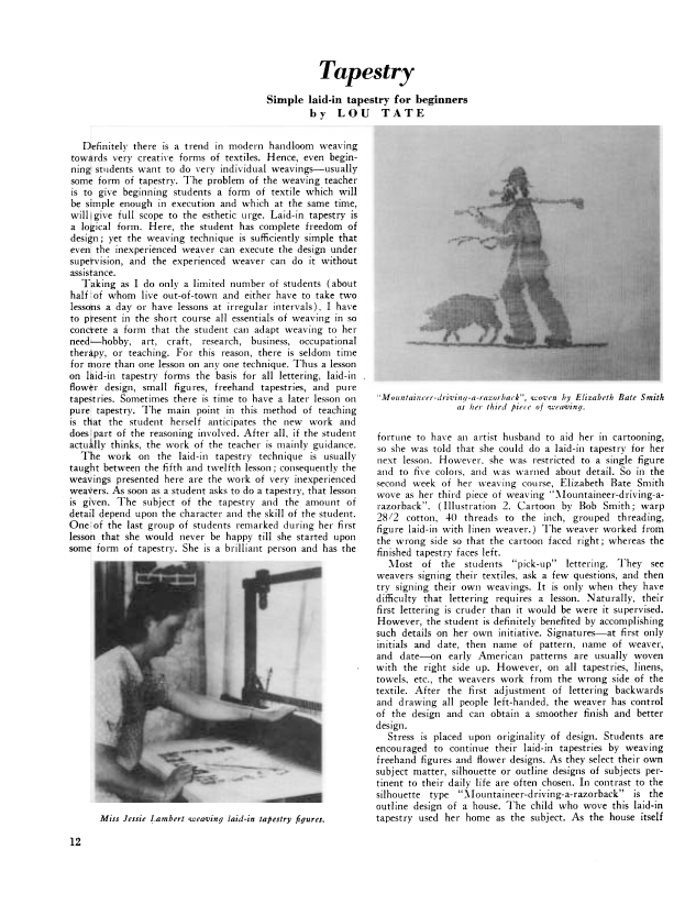 Tapestry, Simple Laid-In Tapestry for Beginners, Tate, Lou. Weaver, Vol. 3 No. 4 (October 1938), 3 pages. Note: PDF provided by Judith Combs. Posted September 2, 2006. SAMPLE PAGE. File size 302 KB PDF