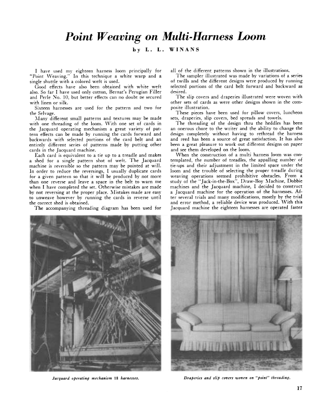 Point Weaving on Multi-Harness Loom, Winans, L.L. Weaver, Vol. 3 No. 4 (October 1938), 3 pages. Note: PDF provided by Judith Combs. Posted September 2, 2006. SAMPLE PAGE. File size 474 KB PDF