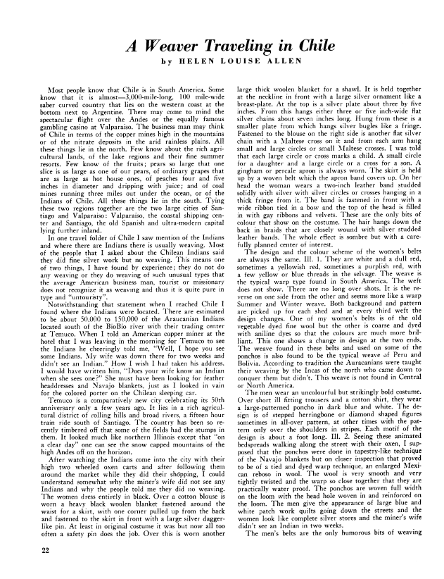 A Weaver Traveling in Chile, Allen, Helen Louise. Weaver, Vol. 3 No. 4 (October 1938), 4 pages. Note: PDF provided by Judith Combs. Posted September 2, 2006. SAMPLE PAGE. File size 423 KB PDF