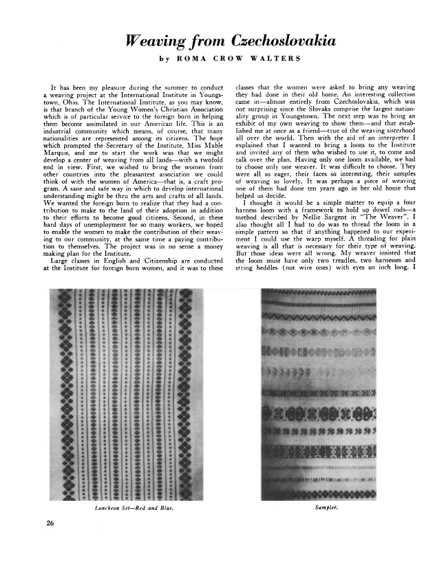 Weaving from Czechoslovakia, Walters, Roma Crow. Weaver, Vol. 3 No. 4 (October 1938), 3 pages. Note: PDF provided by Judith Combs. Posted September 2, 2006. SAMPLE PAGE. File size 312 KB PDF