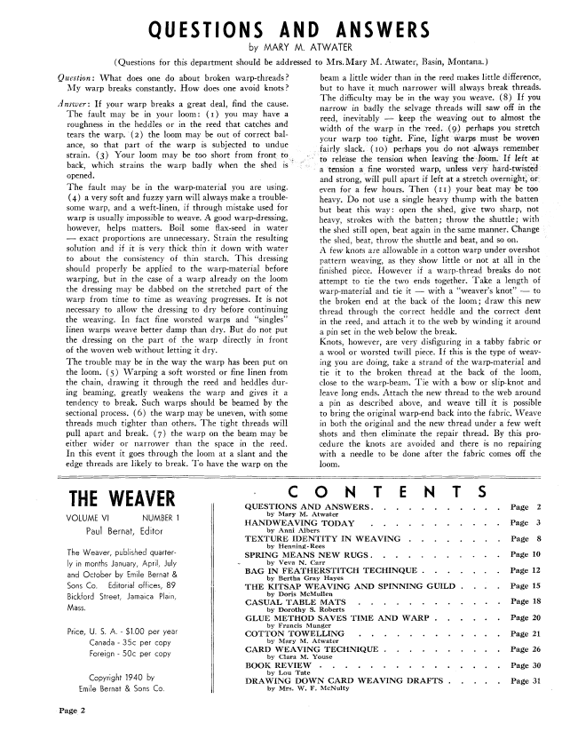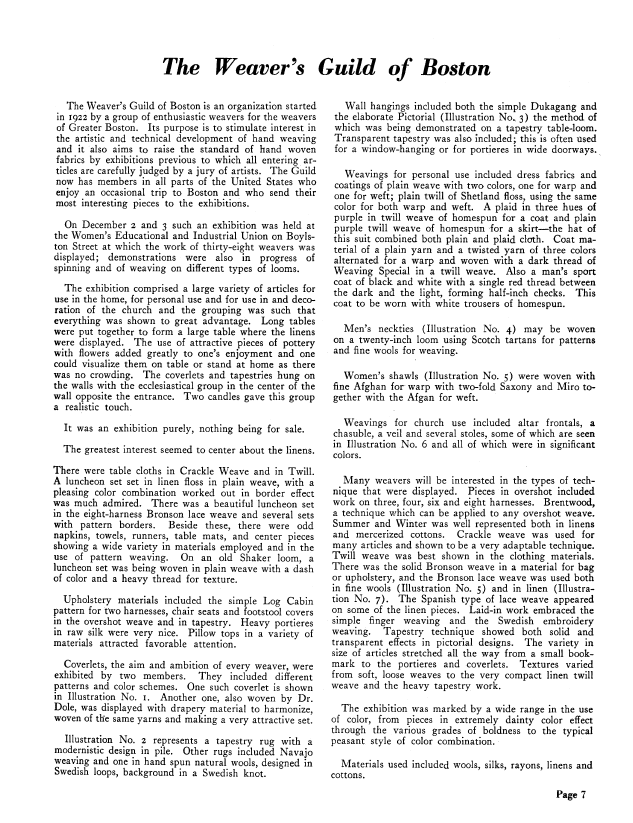 The Weaver's Guild of Boston, ---. Weaver, Vol. 4 No. 1 (January 1939), 9 pages. Note: PDF provided by Judith Combs. Posted September 2, 2006. SAMPLE PAGE. File size 520 KB PDF
