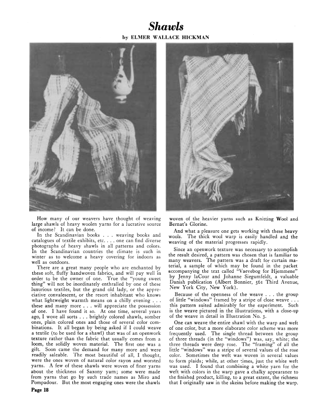 Shawls, Hickman, Elmer Wallace. Weaver, Vol. 4 No. 1 (January 1939), 3 pages. Note: PDF provided by Judith Combs. Posted September 2, 2006. SAMPLE PAGE. File size 315 KB PDF