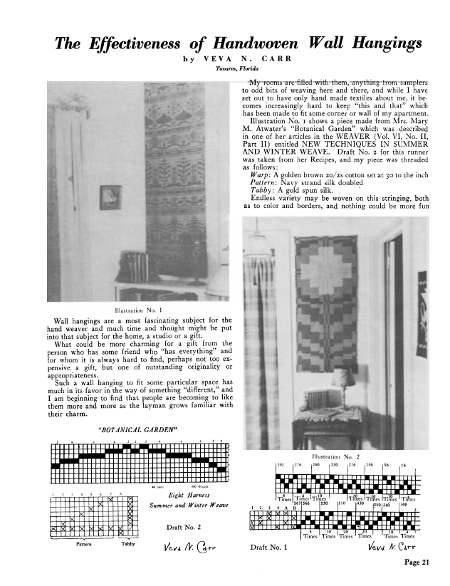 The Effectiveness of Handwoven Wall Hangings, Carr, Veva N. Weaver, Vol. 4 No. 1 (January 1939), 2 pages. Note: PDF provided by Judith Combs. Posted September 2, 2006. SAMPLE PAGE. File size 180 KB PDF