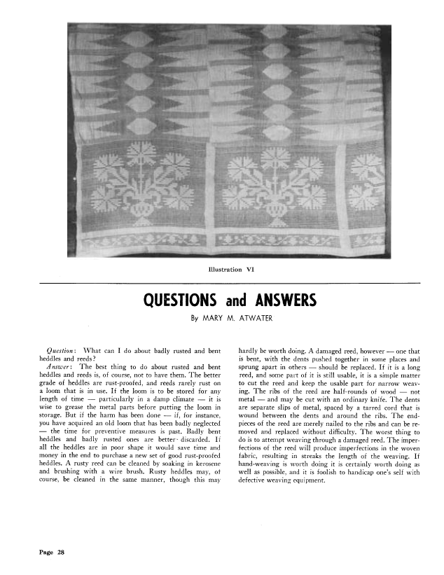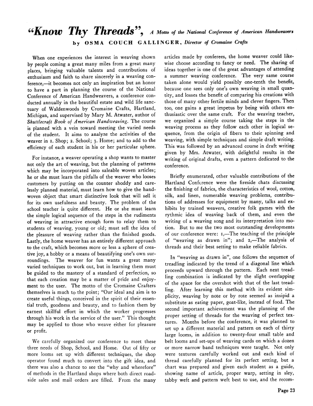 Know Thy Threads, Gallinger, Osma Couch. Weaver, Vol. 4 No. 1 (January 1939), 6 pages. Note: PDF provided by Judith Combs. Posted September 2, 2006. SAMPLE PAGE. File size 540 KB PDF