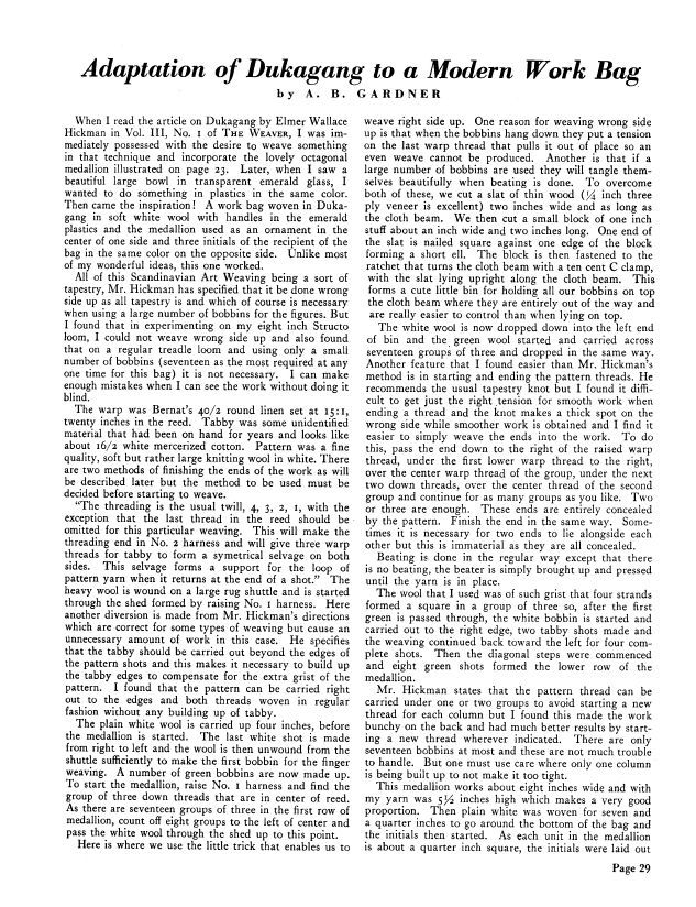 Adaptation of Dukagang to a Modern Work Bag, Gardner, A.B. Weaver, Vol. 4 No. 1 (January 1939), 2 pages. Note: PDF provided by Judith Combs. Posted September 2, 2006. SAMPLE PAGE. File size 257 KB PDF