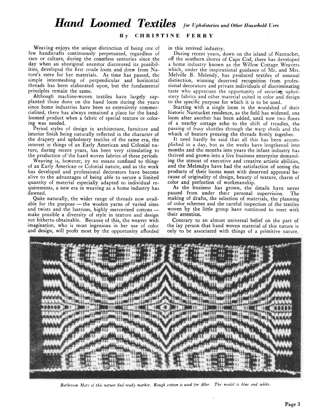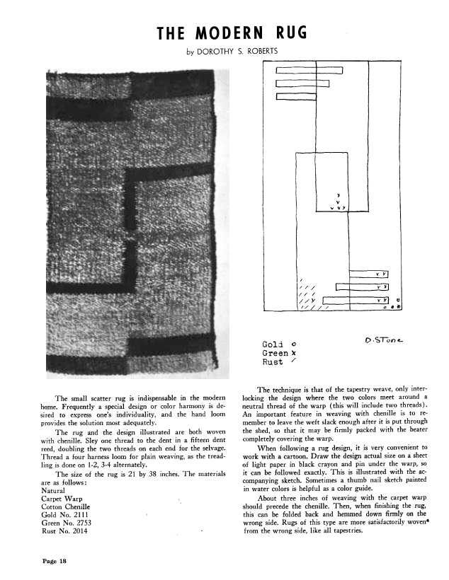 The Modern Rug, Roberts, Dorothy S. Weaver, Vol. 5 No. 1 (January-February 1940), 1 page. Note: PDF provided by Judith Combs. Posted September 2, 2006. SAMPLE PAGE. File size 75 KB PDF