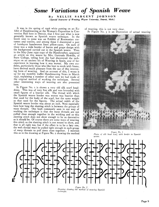 Some Variations of Spanish Weave, Johnson, Nellie Sargent. Weaver, Vol. 4 No. 2 (April 1939), 4 pages. Note: PDF provided by Judith Combs. Posted September 2, 2006. SAMPLE PAGE. File size 384 KB PDF