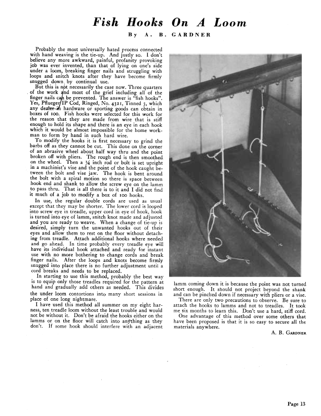 Fish Hooks On A Loom, Gardner, A.B. Weaver, Vol. 4 No. 2 (April 1939), 1 page. Note: PDF provided by Judith Combs. Posted September 2, 2006. SAMPLE PAGE. File size 96 KB PDF