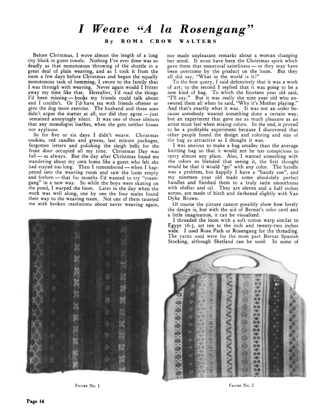 I Weave a la Rosengang, Walters, Roma Crow. Weaver, Vol. 4 No. 2 (April 1939), 2 pages. Note: PDF provided by Judith Combs. Posted September 2, 2006. SAMPLE PAGE. File size 226 KB PDF