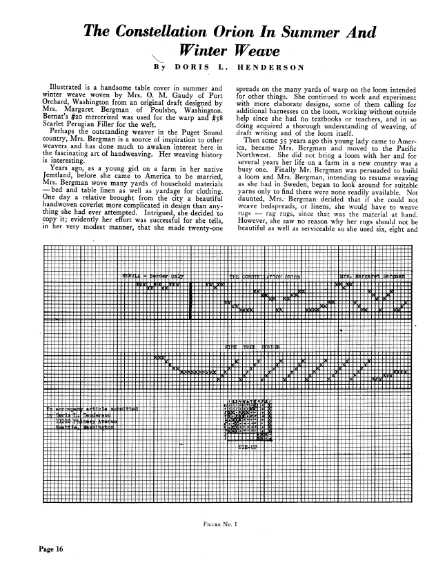 The Constellation Orion in Summer and Winter Weave, Henderson, Doris L. Weaver, Vol. 4 No. 2 (April 1939), 2 pages. Note: PDF provided by Judith Combs. Posted September 2, 2006. SAMPLE PAGE. File size 264 KB PDF