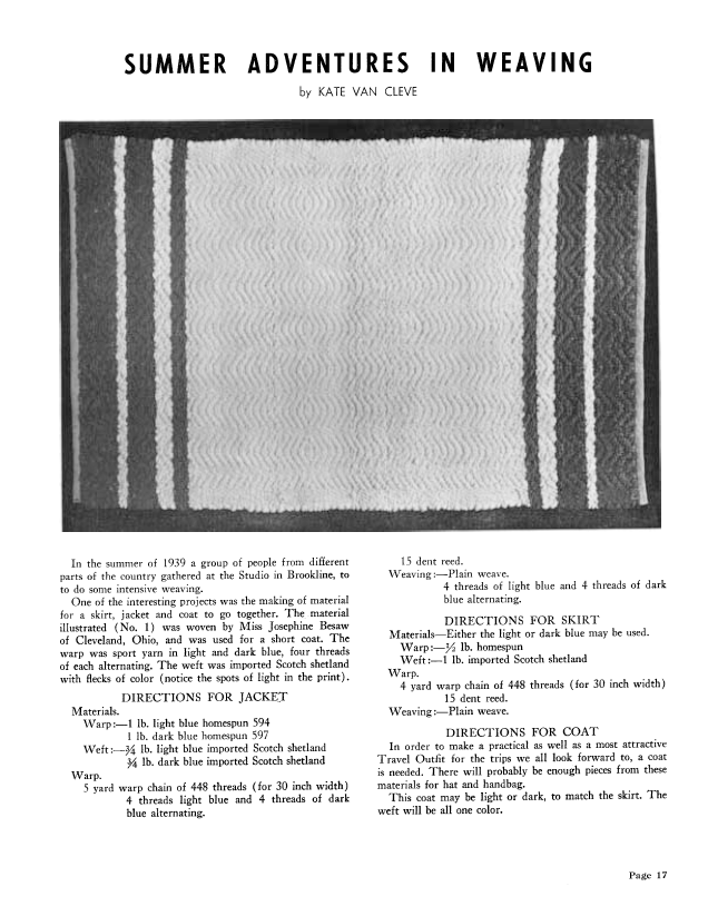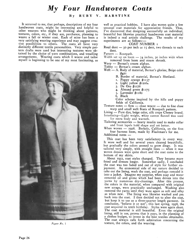 My Four Handwoven Coats, Harstine, Ruby V. Weaver, Vol. 4 No. 2 (April 1939), 3 pages. Note: PDF provided by Judith Combs. Posted September 2, 2006. SAMPLE PAGE. File size 309 KB PDF