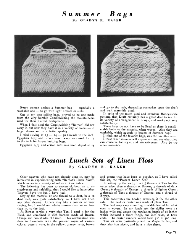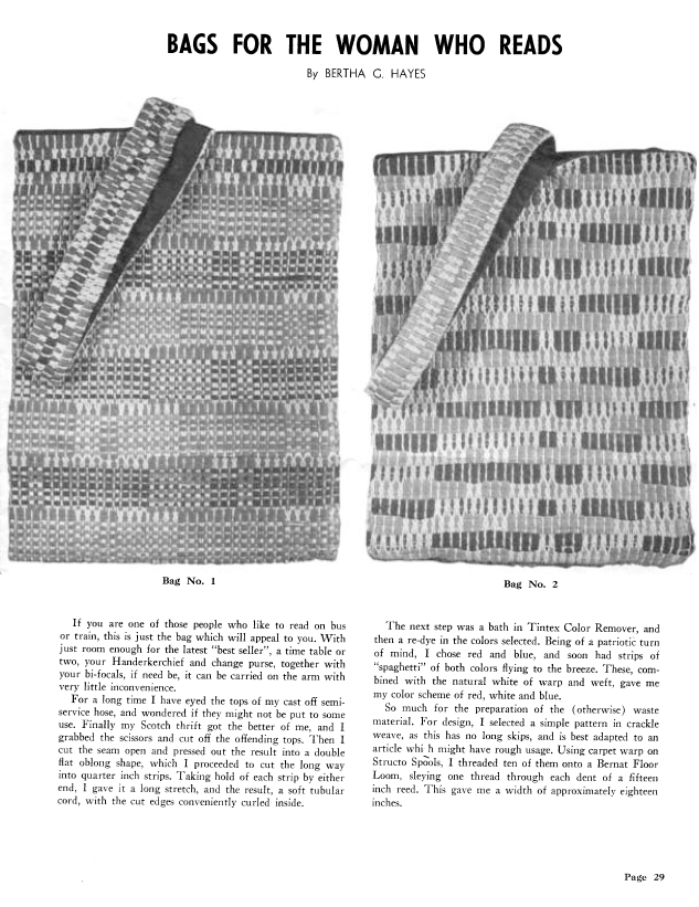 Bags for the Woman Who Reads, Hayes, Bertha Gray. Weaver, Vol. 7 No. 1 (January-February 1942), 2 pages. Note: PDF provided by Judith Combs. Posted September 2, 2006. SAMPLE PAGE. File size 154 KB PDF
