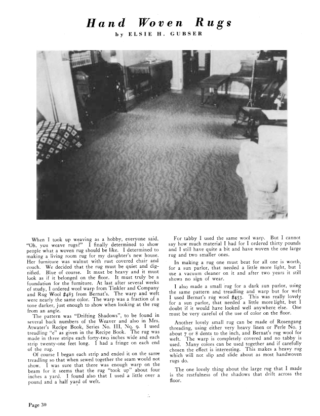 Hand Woven Rugs, Gubser, Elsie H. Weaver, Vol. 4 No. 2 (April 1939), 1 page. Note: PDF provided by Judith Combs. Posted September 2, 2006. SAMPLE PAGE. File size 85 KB PDF