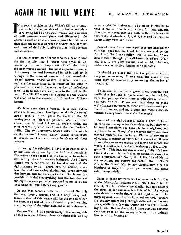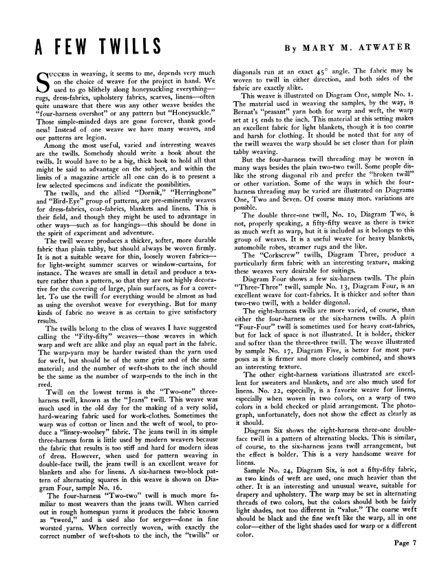 Again the Twill Weave, Atwater, Mary M. Weaver, Vol. 4 No. 4 (October-November 1939), 4 pages. Note: PDF provided by Judith Combs. Posted September 2, 2006. SAMPLE PAGE. File size 660 KB PDF