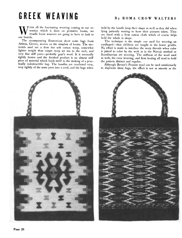 Greek Weaving, Walters, Roma Crow. Weaver, Vol. 4 No. 3 (July 1939), 2 pages. Note: PDF provided by Judith Combs. Posted September 2, 2006. SAMPLE PAGE. File size 135 KB PDF