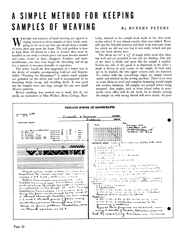 A Simple Method for Keeping Samples of Weaving, Peters, Rupert. Weaver, Vol. 4 No. 3 (July 1939), 2 pages. Note: PDF provided by Judith Combs. Posted September 2, 2006. SAMPLE PAGE. File size 175 KB PDF