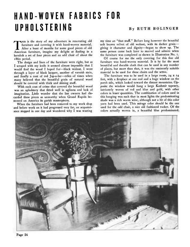 Hand-Woven Fabrics for Upholstering, Bolinger, Ruth. Weaver, Vol. 4 No. 3 (July 1939), 3 pages. Note: PDF provided by Judith Combs. Posted September 2, 2006. SAMPLE PAGE. File size 263 KB PDF