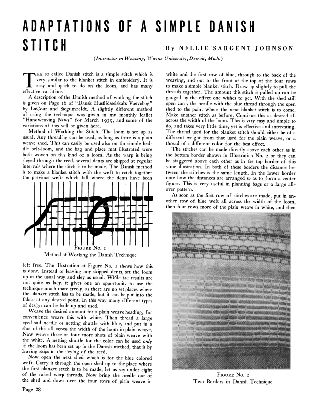 Adaptations of a Simple Danish Stitch, Johnson, Nellie Sargent. Weaver, Vol. 4 No. 3 (July 1939), 2 pages. Note: PDF provided by Judith Combs. Posted September 2, 2006. SAMPLE PAGE. File size 230 KB PDF