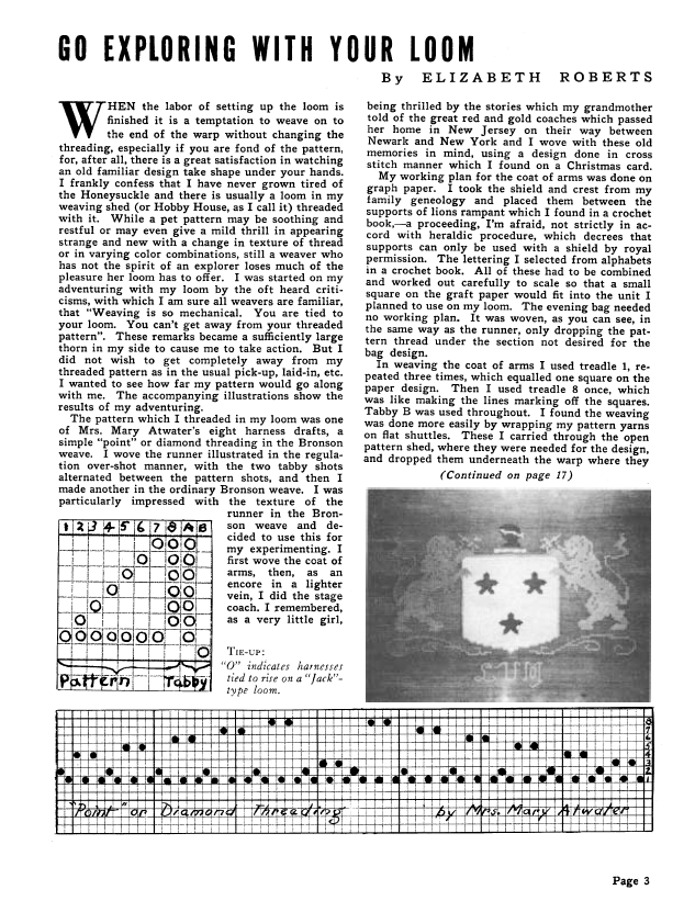 Go Exploring with your Loom, Roberts, Elizabeth. Weaver, Vol. 4 No. 4 (October-November 1939), 3 pages. Note: PDF provided by Judith Combs. Posted September 2, 2006. SAMPLE PAGE. File size 343 KB PDF
