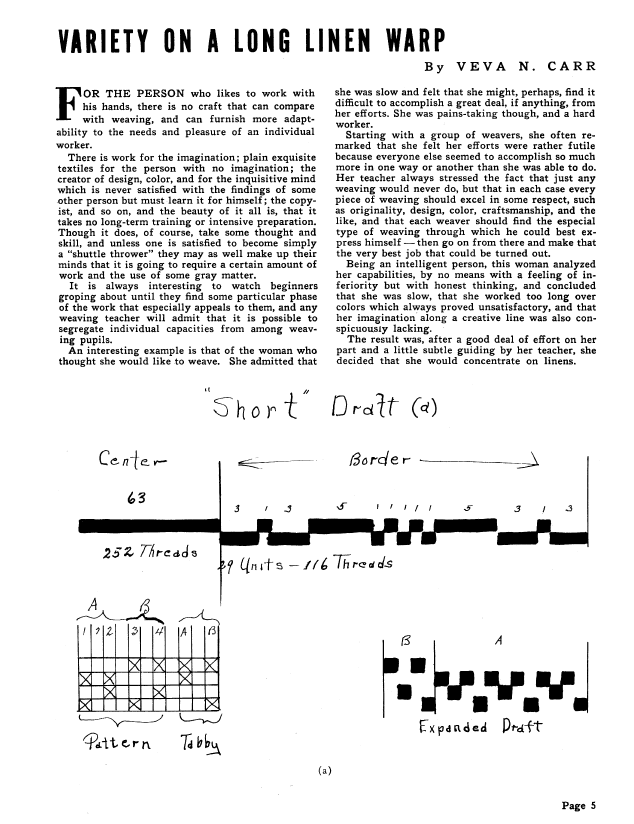 Variety on a Long Linen Warp, Carr, Veva N. Weaver, Vol. 4 No. 4 (October-November 1939), 4 pages. Note: PDF provided by Judith Combs. Posted September 2, 2006. SAMPLE PAGE. File size 240 KB PDF