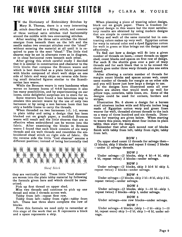 The Woven Sheaf Stitch, Youse, Clara M. Weaver, Vol. 4 No. 4 (October-November 1939), 3 pages. Note: PDF provided by Judith Combs. Posted September 2, 2006. SAMPLE PAGE. File size 414 KB PDF