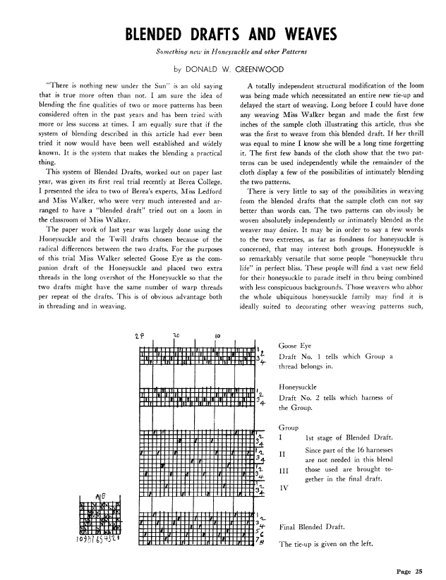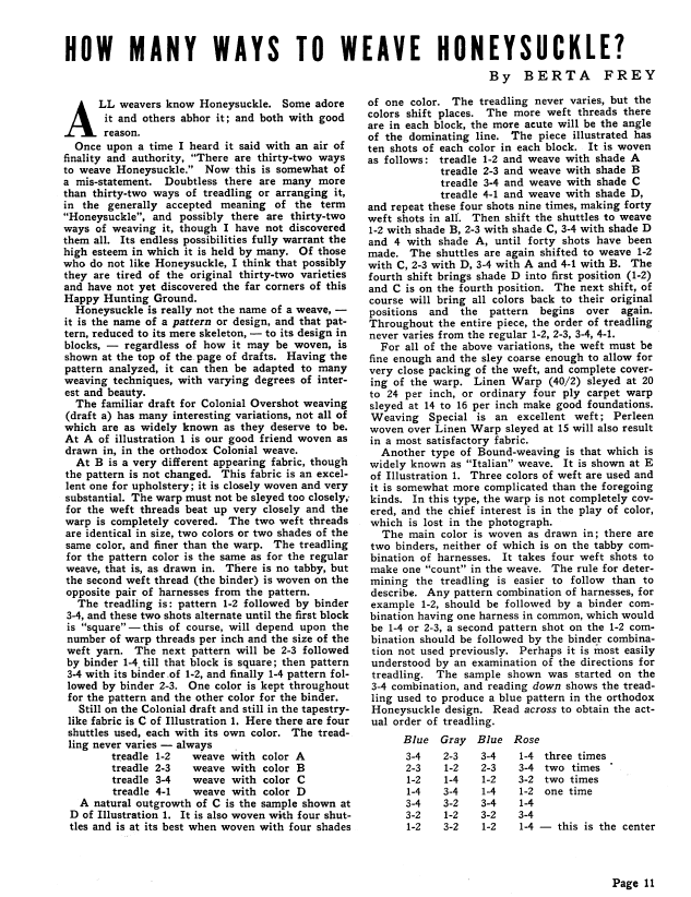 Blended Drafts and Weaves, Something New in Honeysuckle and other Patterns, Greenwood, Donald. Weaver, Vol. 6 No. 2 (April-May 1941), 2 pages. Note: PDF provided by Judith Combs. Posted September 2, 2006. SAMPLE PAGE. File size 177 KB PDF