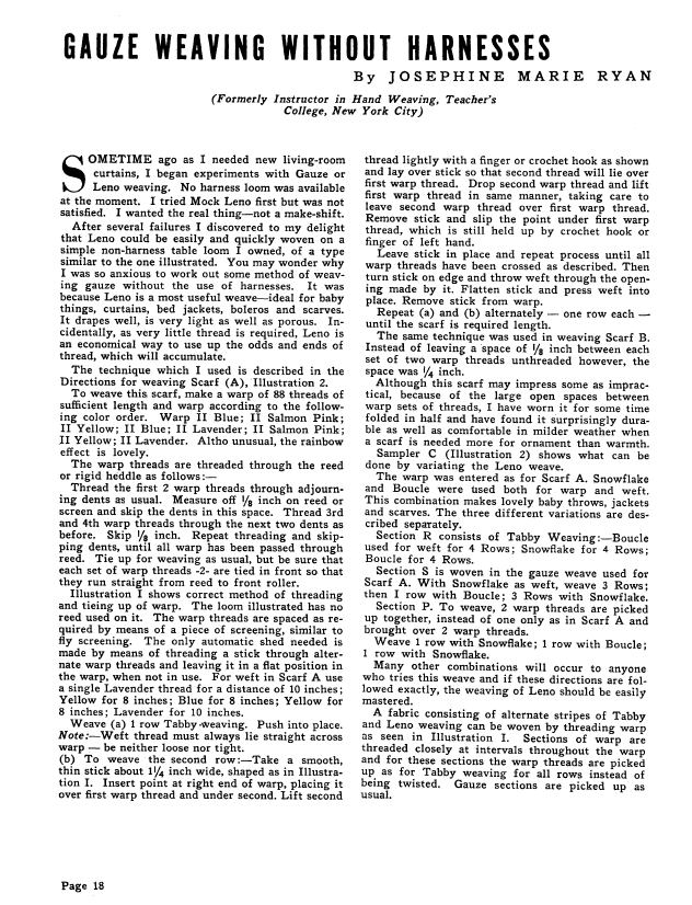 Gauze Weaving without Harnesses, Ryan, Josephine Marie. Weaver, Vol. 4 No. 4 (October-November 1939), 2 pages. Note: PDF provided by Judith Combs. Posted September 2, 2006. SAMPLE PAGE. File size 207 KB PDF