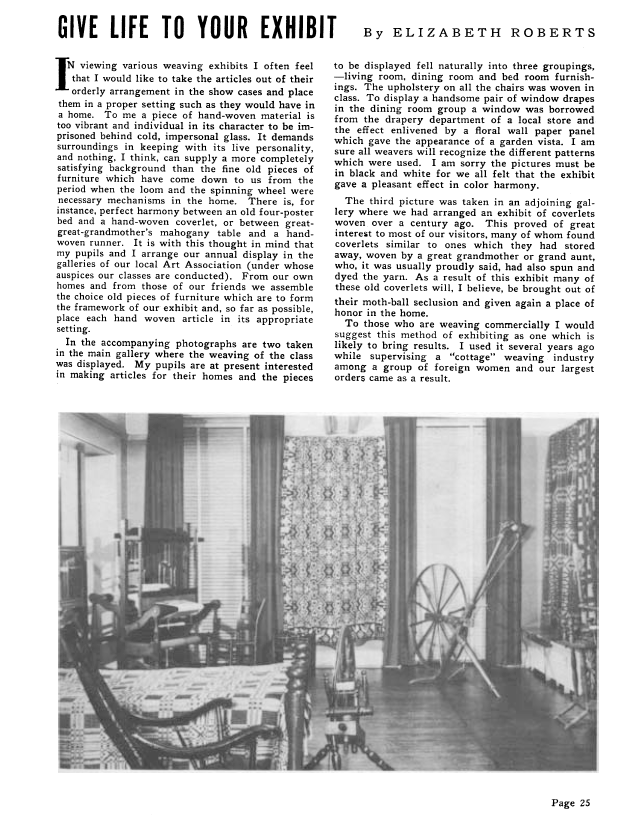 Give Life to Your Exhibit, Roberts, Elizabeth. Weaver, Vol. 4 No. 4 (October-November 1939), 2 pages. Note: PDF provided by Judith Combs. Posted September 2, 2006. SAMPLE PAGE. File size 153 KB PDF
