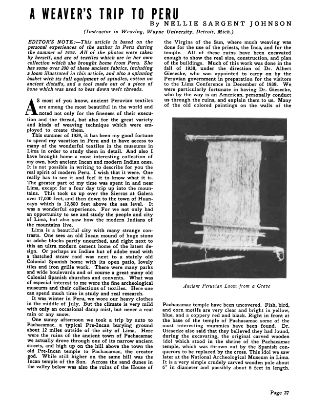 A Weaver's Trip to Peru, Johnson, Nellie Sargent. Weaver, Vol. 4 No. 4 (October-November 1939), 3 pages. Note: PDF provided by Judith Combs. Posted September 2, 2006. SAMPLE PAGE. File size 319 KB PDF