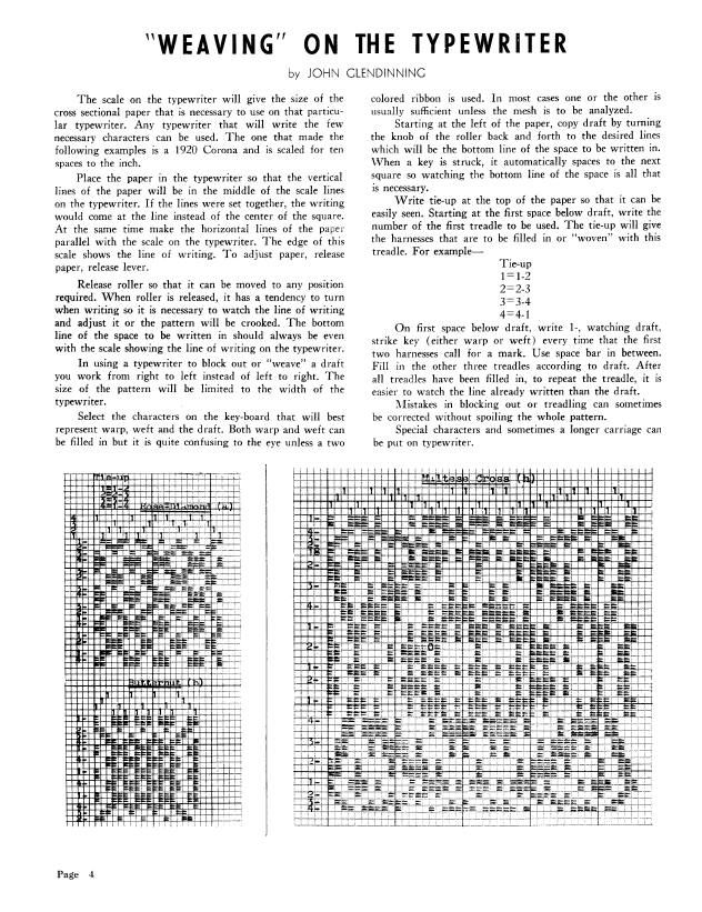 Weaving on the Typewriter, Glendinning, John. Weaver, Vol. 5 No. 1 (January-February 1940), 1 page. Note: PDF provided by Judith Combs. Posted September 2, 2006. SAMPLE PAGE. File size 192 KB PDF