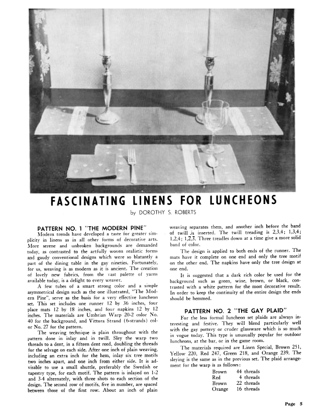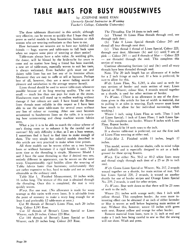 Table Mats for Busy Housewives, Ryan, Josephine Marie. Weaver, Vol. 5 No. 4 (October-November 1940), 2 pages. Note: PDF provided by Judith Combs. Posted September 2, 2006. SAMPLE PAGE. File size 244 KB PDF
