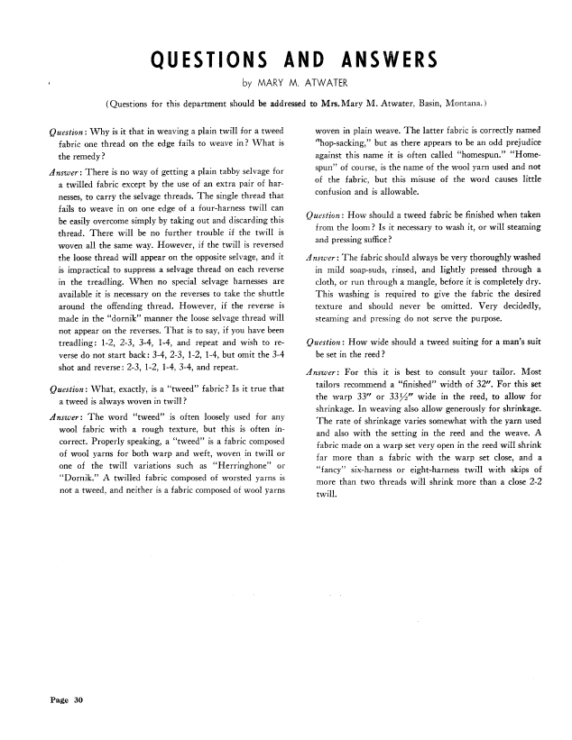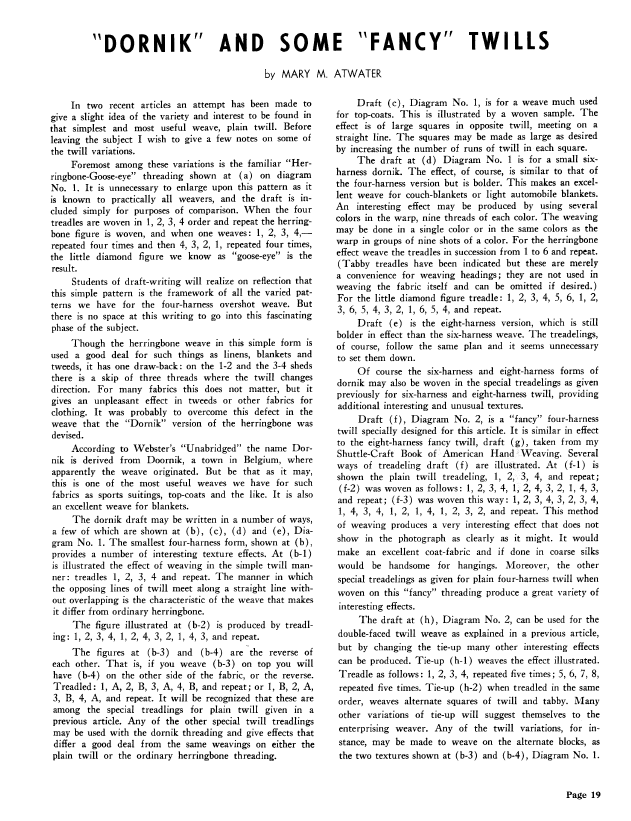 Dornik and Some Fancy Twills, Atwater, Mary M. Weaver, Vol. 5 No. 1 (January-February 1940), 3 pages. Note: PDF provided by Judith Combs. Posted September 2, 2006. SAMPLE PAGE. File size 262 KB PDF