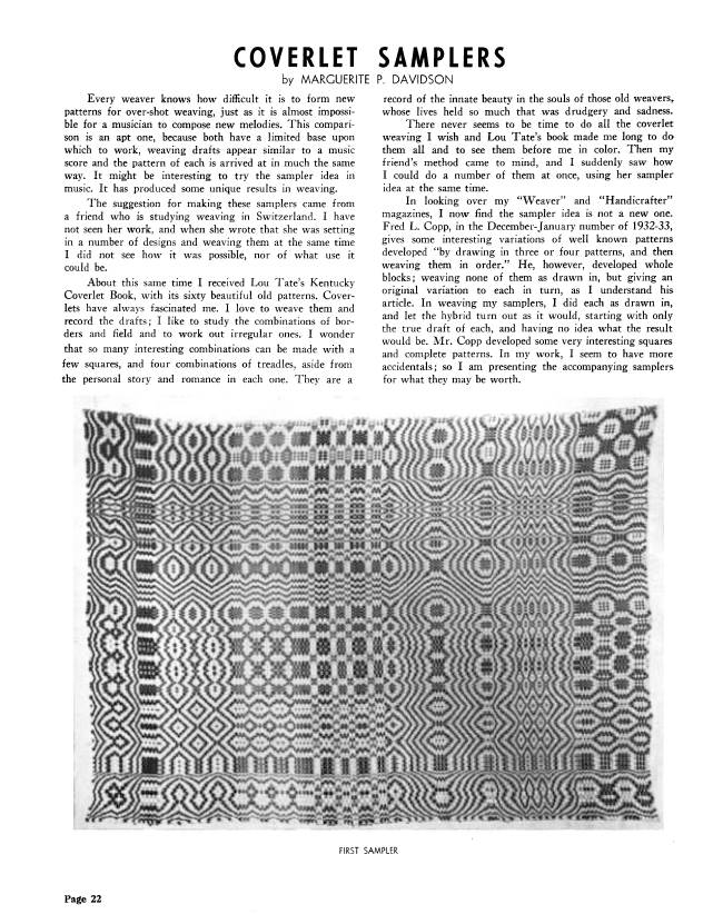 Coverlet Samplers, Davidson, Marguerite P. Weaver, Vol. 5 No. 1 (January-February 1940), 3 pages. Note: PDF provided by Judith Combs. Posted September 2, 2006. SAMPLE PAGE. File size 338 KB PDF