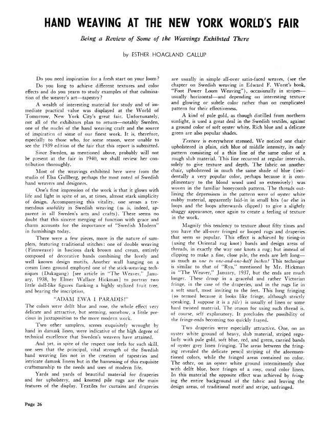 Hand Weaving at the New York World's Fair, Gallup, Esther Hoagland. Weaver, Vol. 5 No. 1 (January-February 1940), 5 pages. Note: PDF provided by Judith Combs. Posted September 2, 2006. SAMPLE PAGE. File size 473 KB PDF