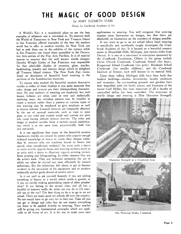 The Magic of Good Design, Starr, Mary Elizabeth. Weaver, Vol. 5 No. 3 (July-August 1940), 4 pages. Note: PDF provided by Judith Combs. Posted September 2, 2006. SAMPLE PAGE. File size 282 KB PDF