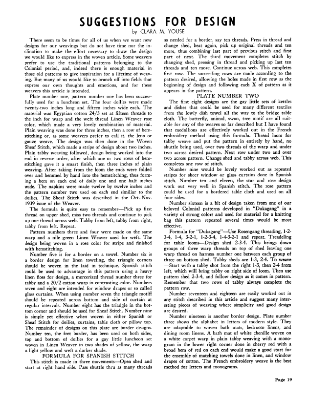 Suggestions for Design, Youse, Clara M. Weaver, Vol. 5 No. 3 (July-August 1940), 4 pages. Note: PDF provided by Judith Combs. Posted September 2, 2006. SAMPLE PAGE. File size 478 KB PDF