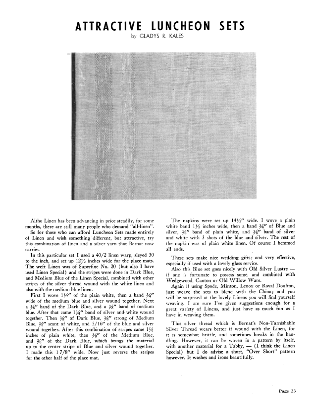 Attractive Luncheon Sets, Kaler, Gladys R. Weaver, Vol. 5 No. 3 (July-August 1940), 2 pages. Note: PDF provided by Judith Combs. Posted September 2, 2006. SAMPLE PAGE. File size 168 KB PDF