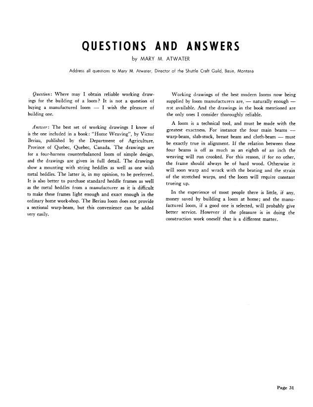 Introduction to Weaving, Holm, Lillian. Weaver, Vol. 3 No. 1 (January 1938), 5 pages. Note: PDF provided by Judith Combs. Posted September 2, 2006. SAMPLE PAGE. File size 456 KB PDF