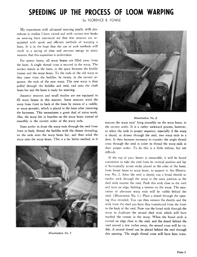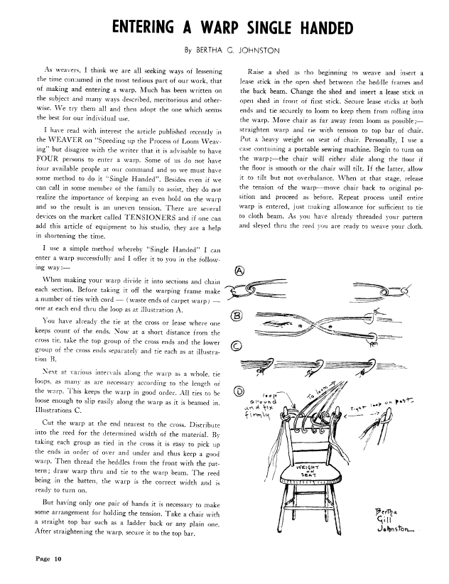 Entering a Warp Single Handed, Johnston, Bertha C. Weaver, Vol. 6 No. 3 (July-August 1941), 1 page. Note: PDF provided by Judith Combs. Posted September 2, 2006. SAMPLE PAGE. File size 110 KB PDF