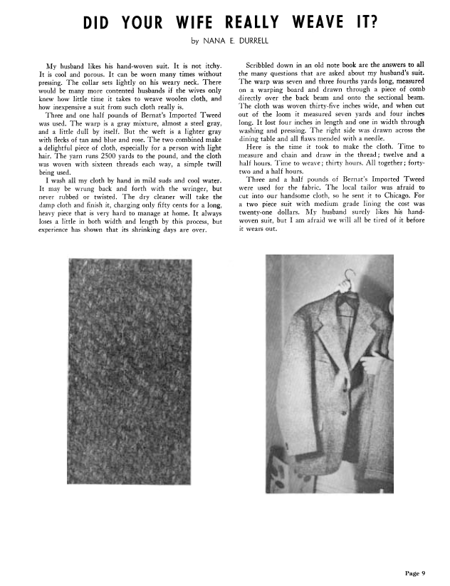 Did Your Wife Really Weave It?, Durrell, Nana. Weaver, Vol. 5 No. 4 (October-November 1940), 1 page. Note: PDF provided by Judith Combs. Posted September 2, 2006. SAMPLE PAGE. File size 77 KB PDF